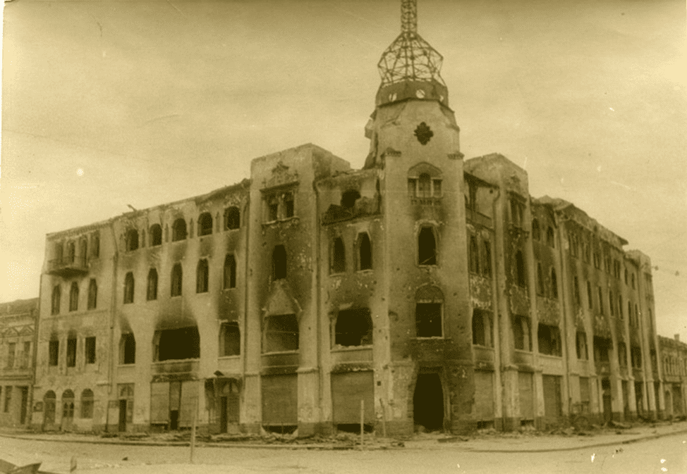 Еще одним памятником города, пострадавшим во время Второй мировой войны, является дом Хренникова, в котором размещен с 1953 года отель «Украина».