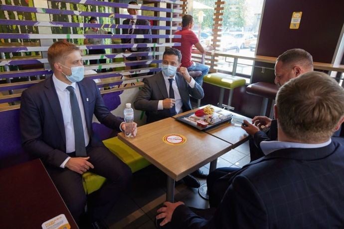 Перебуваючи у Дніпрі, Володимир Олександрович не нехтував і можливістю перекусити у McDonalds – демонструючи, що “Слуга Народу” від цього самого народу не відірвався. Замовлення робив він у масці, що ніяк не збігається з відзначенням Дня Незалежності, де Зеленський не мав і натяку на маску, як і усі, хто брав участь у святі в Києві.