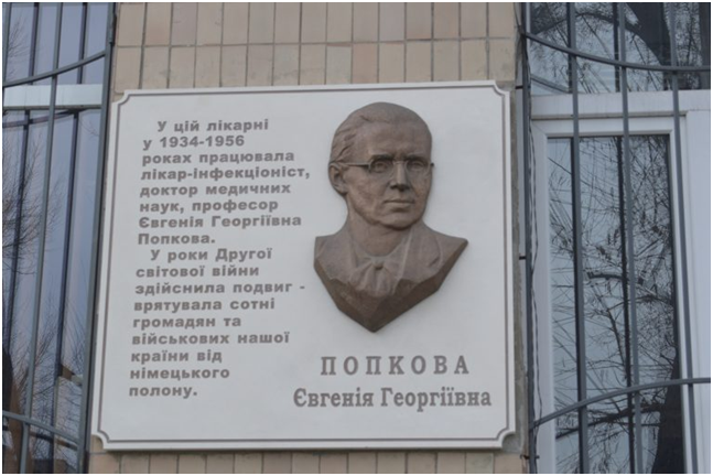 Колектив лікарні добився присвоєння імені Євгенії Попкової міській лікарні №21, їх ініціативу підтримали врятовані лікаркою військовополонені. Прохання задовольнили у 1975 році, на будівлі закладу урочисто відкрили меморіальну дошку керівнику медичного підпілля. Крім того, комплекс будівель лікарні отримав статус історичної пам’ятки. В роки незалежності України меморіальну дошку замінили на сучасний формат, не змінюючи змісту.