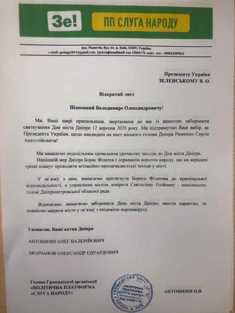 У мережу Інтернет потрапив лист, правдивість якого ще не підтверджена офіційною позицією “Слуг Народу”. У ньому локальні осередки партії “Слуга Народу” написали лист президенту, в якому зазначили свою прихильність до вибору Зеленського щодо свого кандидата на міські вибори, ним став Сергій Риженко. У другому абзаці вони назвали Бориса Філатова справжнім ворогом народу, що на вкрадені гроші планує проводити агітацію. Проведення масових заходів вони відмітили недоцільним. Локальні представники “Слуги Народу” вимагають притягнути Бориса Філатова до кримінальної відповідальності, а управлінням міста довірити голові Дніпропетровської обласної ради – Святославу Олійнику. Документ був завізований іменами Антошкіна Олега Валерійовича та Молчанова Олександра Едуардовича.